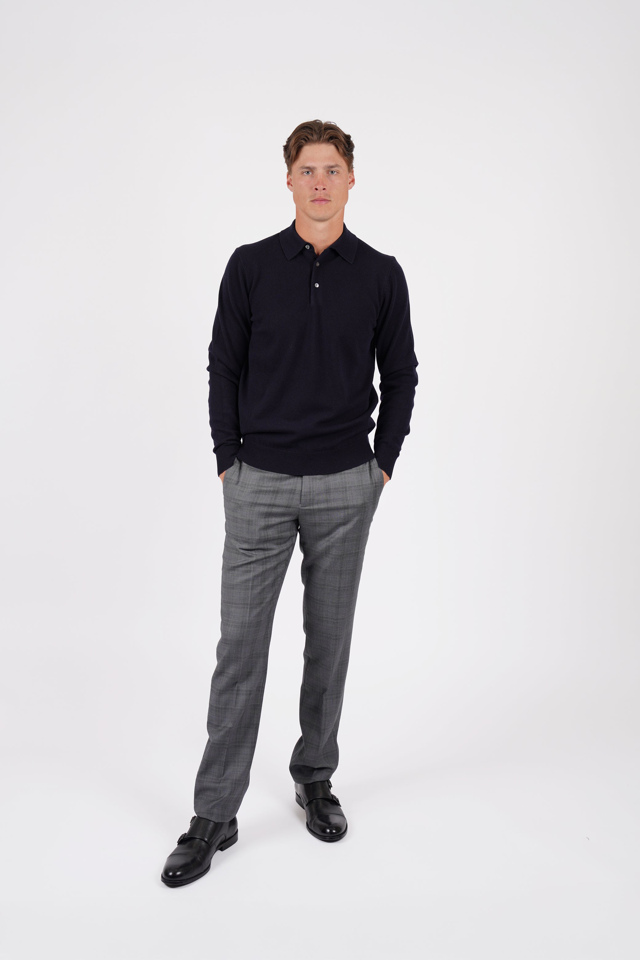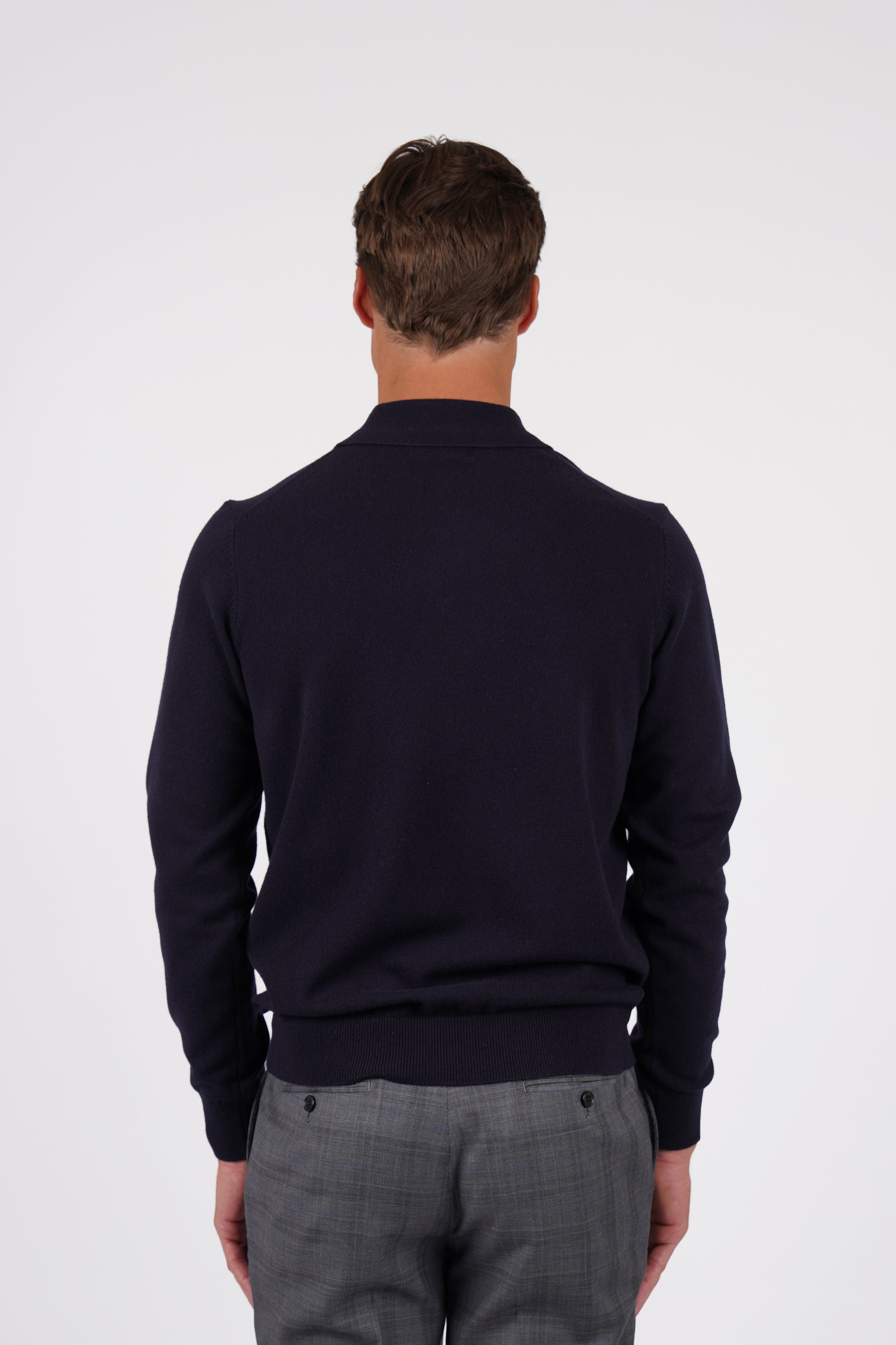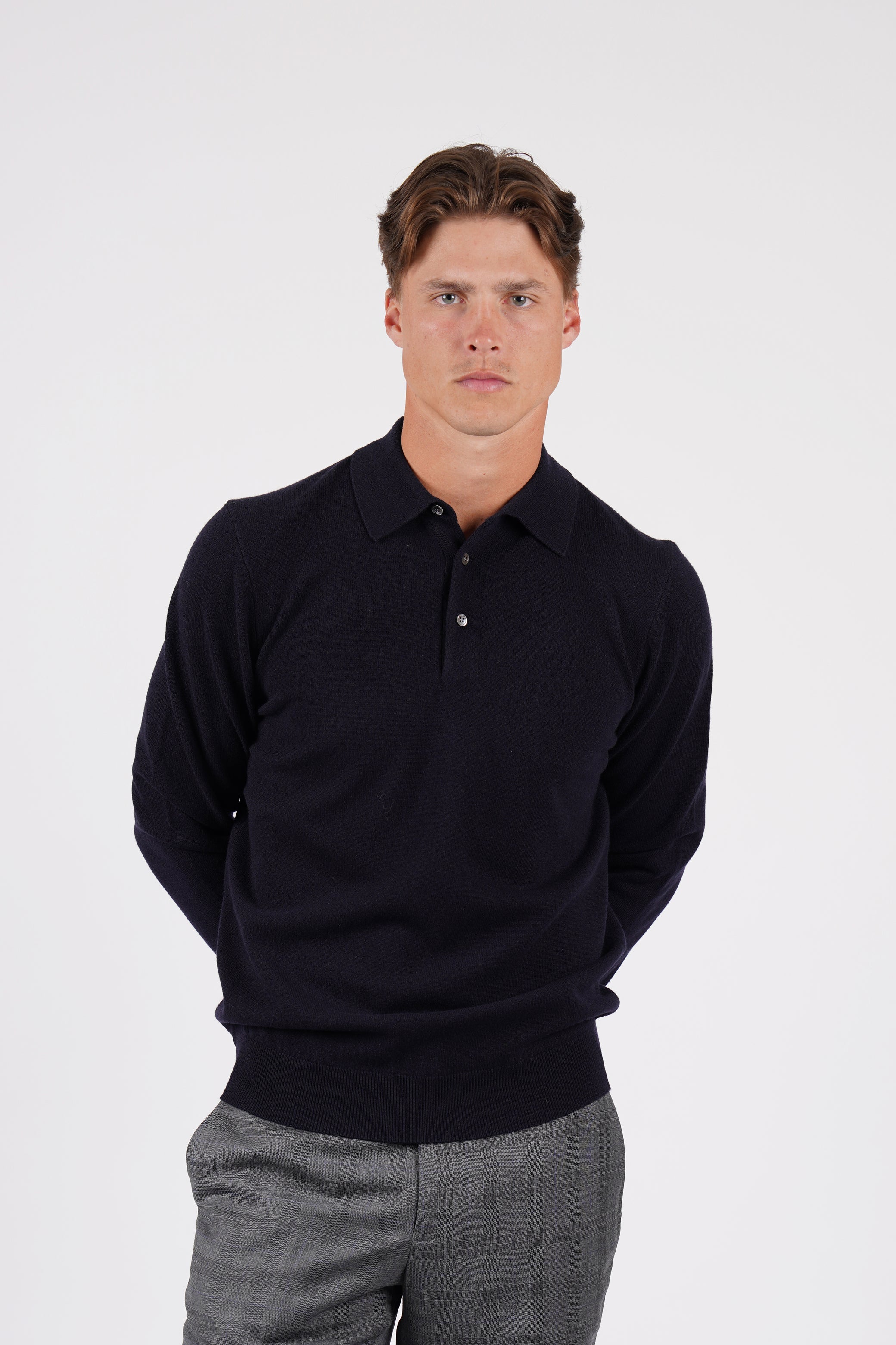 Lightweight and luxuriously soft, this navy merino wool polo features ribbed cuffs and hem, with elegant mother-of-pearl buttons for a refined finish.